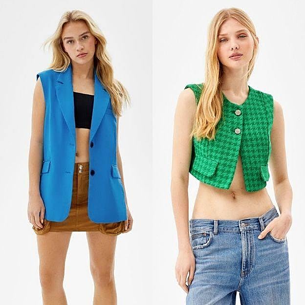 Bershka apuesta por los colores de la temporada en estos diseños tan favorecedores. Un elegante chaleco largo de sastre con cuello solapa de muesca, bolsillos con tapeta en el delantero y cierre de botones, en turquesa (también disponible en tonos neutros como el negro y el camel), a 25,99 euros. O la otra opción, un chaleco cropped en tejido de estructura, con cuello redondo y aplicaciones de botones joya, en verde y con estampado pata de gallo, también por 25,99 euros.