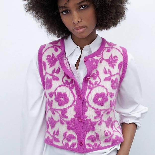Puedes decidirte por este chaleco de punto jacquard con tacto suave, cuello redondo, manga sisa, cierre de botones a tono y patrón floral, en tonos malva y blanco, por solo 22,95 euros. Toma nota de los trucos de estilo de las influencers y combínalo con blusas románticas de cuello bobo y faldas midi o vaqueros, junto a unas bailarinas o mocasines.