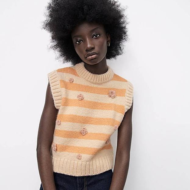 La última propuesta de Zara es un clásico mejorado. Se trata de un chaleco de punto con estampado de rallas, cuello redondo con volumen, acabados en rib y bordados de flores en relieve, a contraste, en tonos naranja, muy coqueto, al mismo precio que el anterior, 25,95 euros. Con unos vaqueros tipo 'mom', unas deportivas y un abrigo de punto o estilo batín con cinturón, te quitarás muchísimos años de encima a la par que irás cómoda a diario.