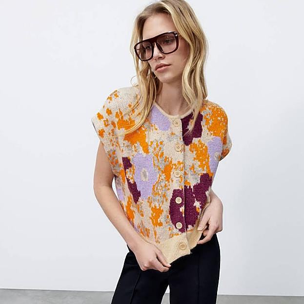 Continuamos con un original chaleco de punto jacquard con cuello redondo, manga sisa con costura del hombro caído, cierre de botones y maxi 'floral print', en tonalidades naranja, morado, lila, verde y crudo, con un coste de 25,95 euros. Lo puedes lucir abierto o cerrado, con 'bralettes' de punto y pantalón de cintura alta o falda, en alguno de los colores en combinación que incorpora la penda. Al igual que, de momento, para combatir el frío, otra idea es conjuntarlo con jersey ajustado de cuello alto, 'jeans' acampanados y botines de tacón.