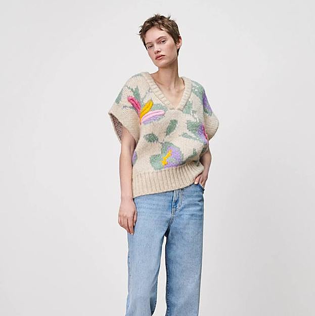 La siguiente opción es este precioso chaleco oversize de punto, con hombros caídos, cuello de pico, acabados en rib. Combina el jacquard y los bordados florales multicolor, en beige de base. Y, está disponible en las talla S, M y L, a 35,95 euros. Lo bueno de este diseño es que, al tener un tono neutro, no es necesario quebrarse la cabeza con combinaciones. En un conjunto con pantalón de traje y botines o por encima de un maxi vestido, queda de maravilla.