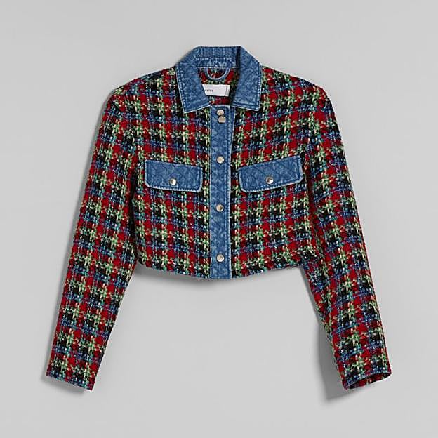 Se trata de una chaqueta con un diseño cropped -perfecta para usar con prendas de talle alto- y de tejido combinado. Es decir, combina el denim, que va en remates, bolsillos y solapas, con el tweed, que cubre el resto de la prenda. Y este último tiene un estampado de cuadros en tonos rojos, verdes y azules ideal que combina muy bien con casi todo y que conseguirá dar un toque diferente a tus outfits básicos del día a día.