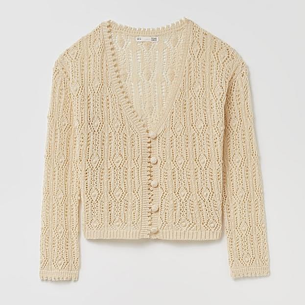 Se trata de una chaqueta de punto de tipo calado con manga larga, cuello redondo, cierre de botones frontales, bajo corto y en un color beige que sienta de maravilla y que siempre vuelve con la temproada primavera/verano. Porque favorece a todos los tonos de piel pero no nos engañemos, especialmente cuando ganamos un tonito más de bronceado. Para llevar con camisetas básicas, vaqueros y zapatillas cómodas a diario, o para elevar el nivel de un estilismo más sofisticado con pantalón de traje o faldas midi súper de lo más elegantes.