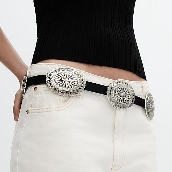 Cinturón fino de efecto piel con chapas metálicas redondeadas grabadas de Lefties. Precio: 12,99 euros.