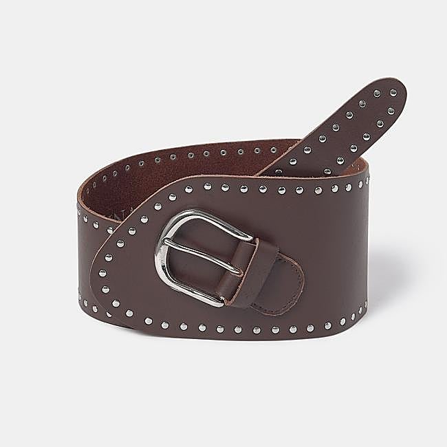 Cinturón de piel asimétrico en color marrón con tachas de Brownie que está disponible en tres medidas. Precio: 39,90 euros.