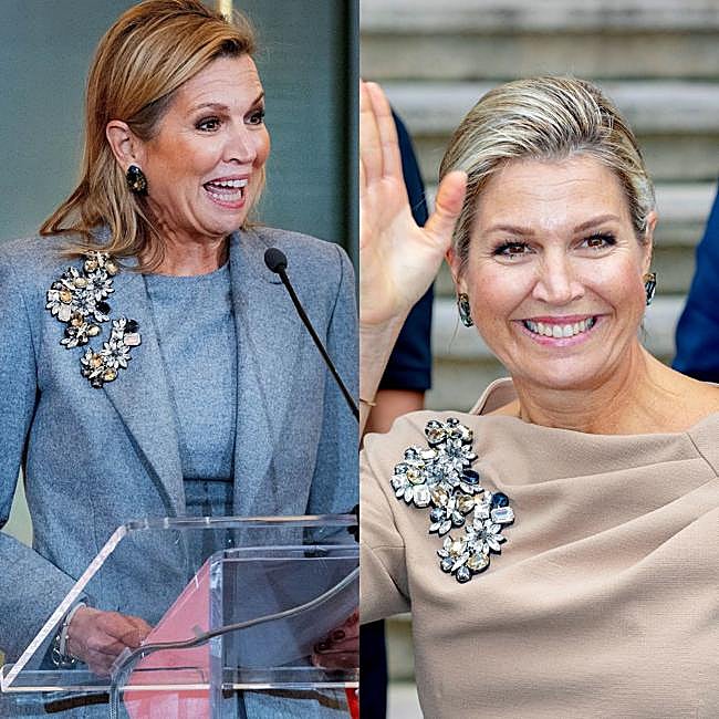 En su última aparición pública, Máxima ha elevado un traje de chaqueta y pantalón de color gris con este broche que ya le vimos en 2019 durante una conferencia. Se trata de una pieza XL con un llamativo diseño floral en tonalidades azules que ha usado para protagonizar estilismos básicos y monocolor.
