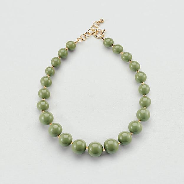 Este es un collar acabado en oro de bolas de acetato de Agatha Paris. Lo tienes disponible en tono marfil, coral y este bonito tono verde, una apuesta de lo más favorecedora para esta primavera verano. Precio: 89 euros.