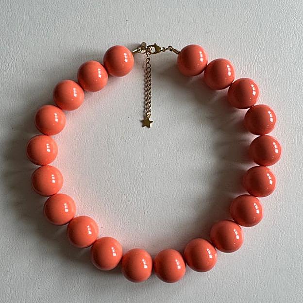 El collar Candy de Ane&Grace es un collar de bolas grandes de resina en un bonito y favorecedor color coral. Se trata de un modelo disponible en varios colores que la creadora de esta firma española hace a mano. Precio: 29,95 euros.