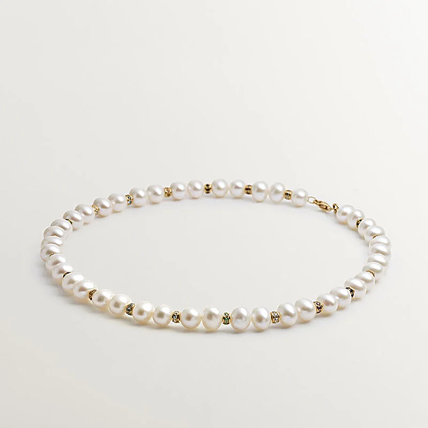 Y si lo que quieres es un collar para ocasiones especiales con el que no pasar desapercibida, en esta selección no podía faltar un modelo de M de Pulet. Lleva perlas asimétricas, mezcla de tamaños, tonalidades sutiles en marfil, blanco y rosado así como formas irracionales. Precio: 480 euros.