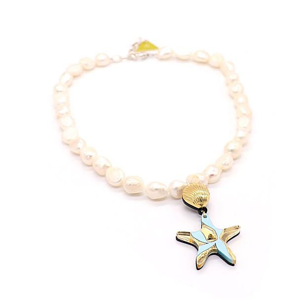Los collares de perlas tienen un sinfín de versiones aptas para las más elegantes o las que quieren, por ejemplo, añadir algo de color con las joyas. Para estas últimas, nos encanta este modelo de Lausett con el colgante de una estrella en dorado y azul. Precio: 90 euros.
