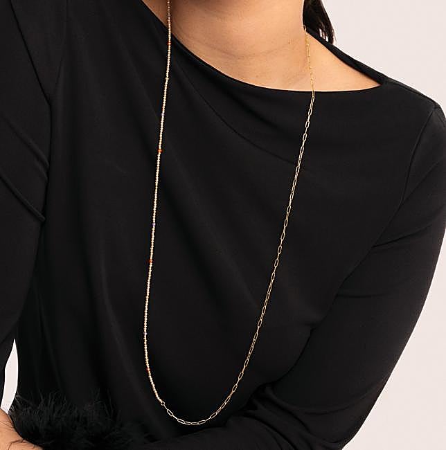Cadena de eslabones pequeñitos de acero inoxidable bañados en oro combinada con cristales de colores de Singularu (rebajado a 26,99 euros).