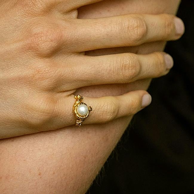 Anillo de plata bañado en oro de 24 quilates acompañado de una perla en el centro. Esta pieza es perfecta para cualquier ocasión, combinable con el resto de nuestros básicos que elevarán cualquier look tanto de día como de noche. Precio: 180 euros.