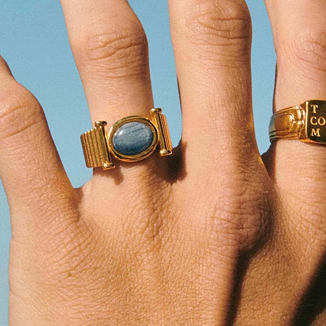Inspirado en las Columnas de Hércules, este diseño reinterpreta lo que durante siglos se consideró el fin del mundo como el inicio de una travesía. Es también un guiño a los mitos antiguos y a las ilusiones ópticas que aparecen en las largas columnatas, donde la luz y la sombra engañan al ojo. En su centro, una piedra de cianita azul intenso brilla como un tesoro escondido en el mar. Precio: 110 euros.
