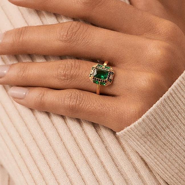 Anillo tipo solitario bañado en oro con circonita verde esmeralda rectangular y rematado con múltiples circonitas en tamaños y formas diferentes mezclando los colores verde esmeralda, negro y blanco de una forma sublime. Una joya que no pasa desapercibida y que siempre querrás mirar cuando la lleves puesta. Precio: 80 euros.