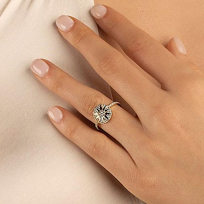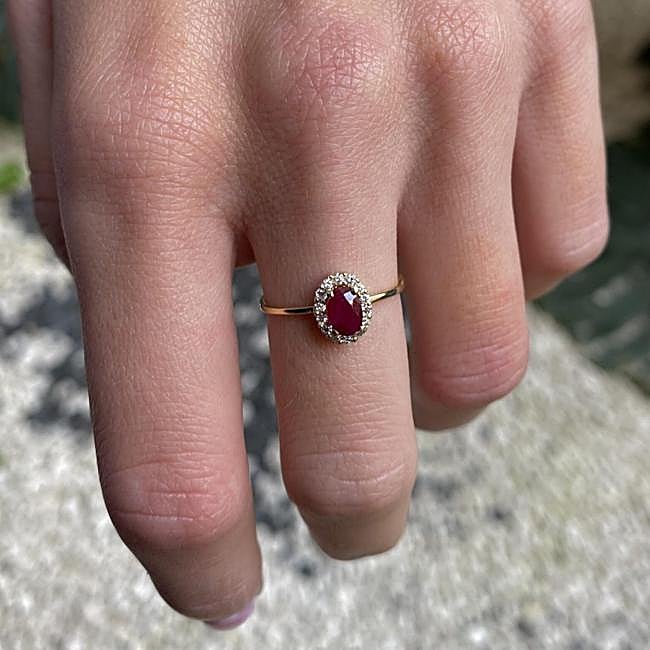Aumenta tu elegancia de una forma accesible y adecuada a tu estilo con nuestro Anillo Rosetón Rubí y diamantes, elaborado en Bea Soldado. Este anillo, fabricado en oro de 9 quilates, presenta una piedra natural, un rubí oval en el centro, realzado con brillantes de 0,14ct. Precio: 458 euros.