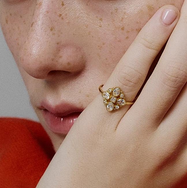 Anillo con pieza vintage formada por circonitas de diferentes formas. Una joya perfecta para bodas, eventos, ocasiones especiales o para el día a día. Es una pieza especial de la colección FW25, diseñada en su estudio de Barcelona. Precio: 45 euros.