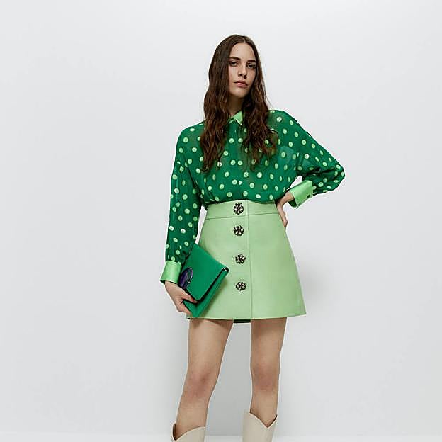 Hablamos de este conjunto de cazadora confeccionada en piel, con cuello camisero, estructura cuadrada, bolsillos delanteros con solapa y cierre de botones joya hechos de cristales en forma de flor, en tono verde agua, por un precio de 259 euros. Prenda a la que se le suma una minifalda en línea A con talle alto y detalles de botones enjoyados, en el mismo material y color, con un coste de 179 euros.