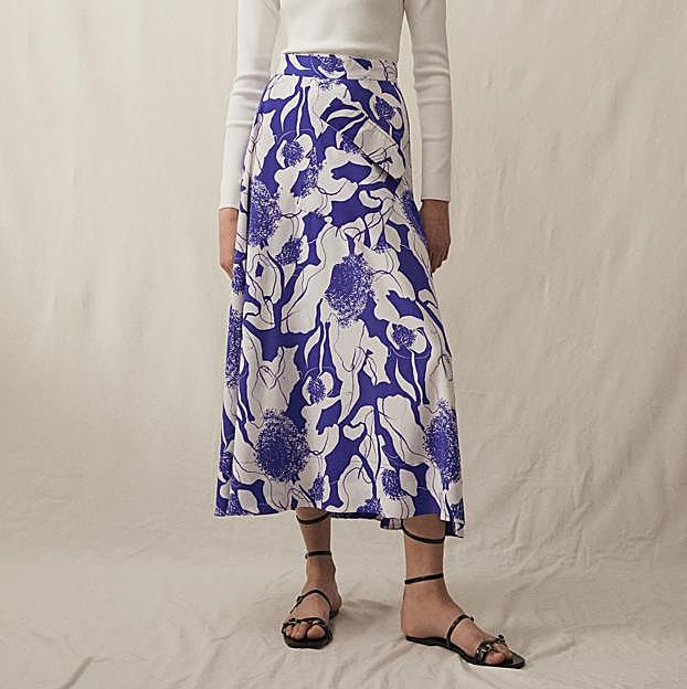 Se trata de un dos piezas formado por una falda midi y un top con un estampado floral en color blanco sobre un fondo azul eléctrico. La falda es un modelo de vuelo con corte evasé y de talle alto que lleva una abertura lateral. Costaba 35,99 euros y ahora puedes hacerte con ella por tan solo 15,99 euros. Un descuentazo que merece muchísimo la pena y que ha hecho que se haya agotado en la web de la firma.