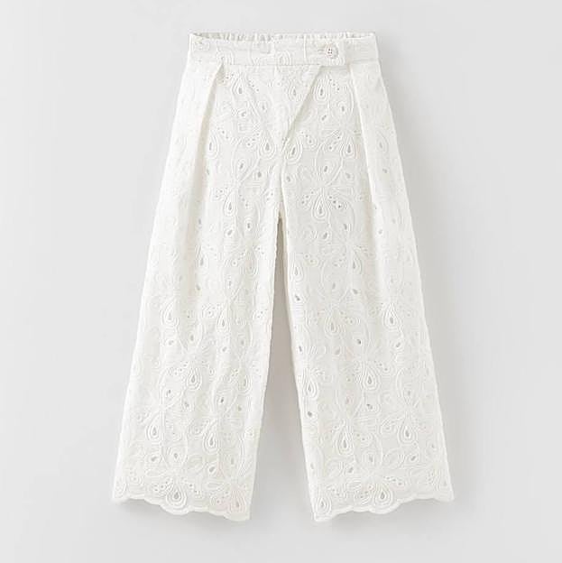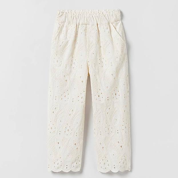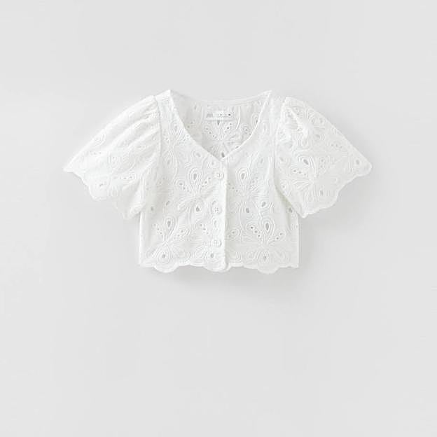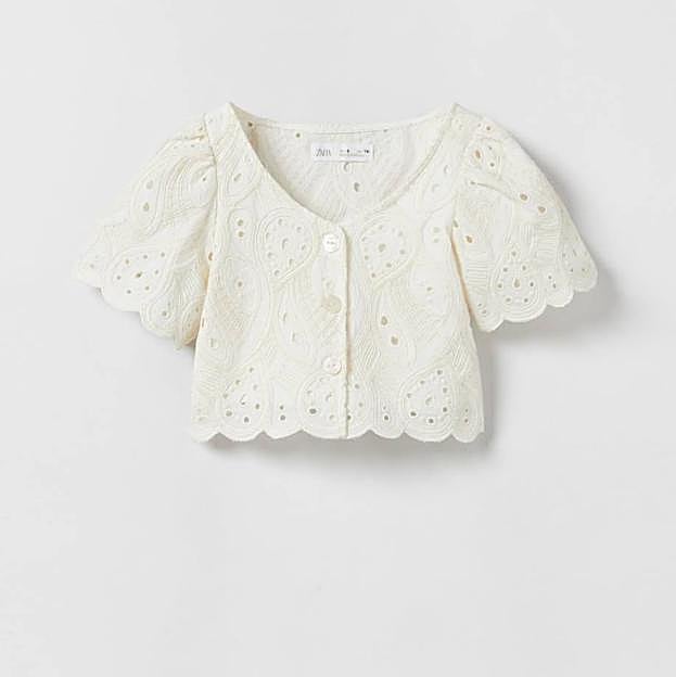 Pero, lo bueno no acaba aquí, ya que sí que hay un conjunto prácticamente idéntico en el apartado de descuentos de Zara Kids que sí que es un chollazo absoluto. Este también se trata de un set en blanco de parte de arriba y parte de abajo, en tejido perforado con bordado suizo. La blusa un diseño parecidísimo, también con escote de pico y manga corta, mientras que el pantalón es un diseño de pernera recta y amplia, con detalle de pizas, cierre frontal cruzado mediante botón y cinturilla elástica.