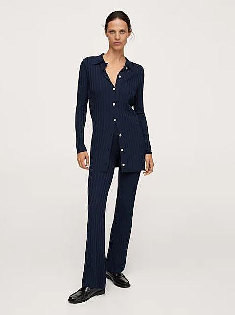 Se trata de un dos piezas de punto en color azul marino formado por un cárdigan y unos pantalones. El primero de ellos es un diseño muy original ya que es un modelo largo y ajustado, de manga larga y cierre de botones que además lleva un cuello solapa consiguiendo ser así un híbrido entre camisa y polo. Cuesta 29,99 euros y es ideal para llevarlo con solo un botón abrochado y sin nada debajo o como chaqueta fina de entretiempo.