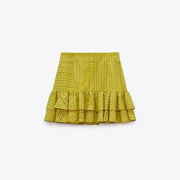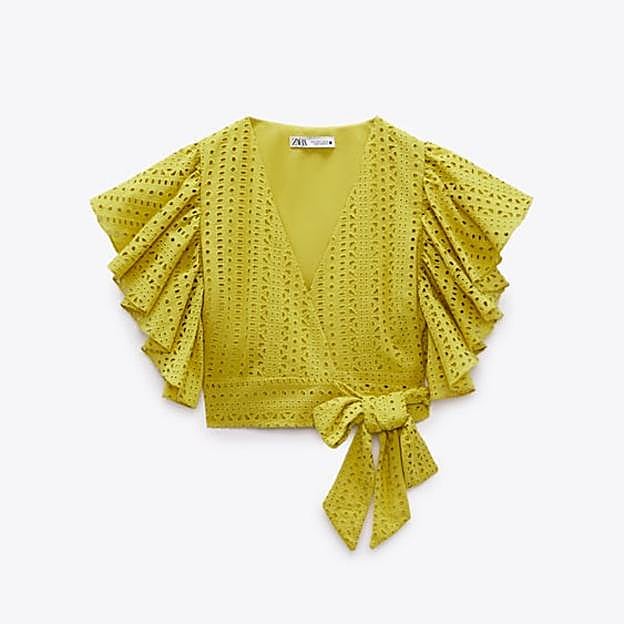 Es un conjunto de bordados perforados de Zara y, gracias a su color mostaza, es ideal para resaltar ese bronceado incipiente que ya lucen las más afortunadas. El top cruzado es muy llamativo debido a sus volantes en las mangas y su corte cropped con lazada, que se ajusta a la cintura creando un efecto estilizador muy favorecedor.