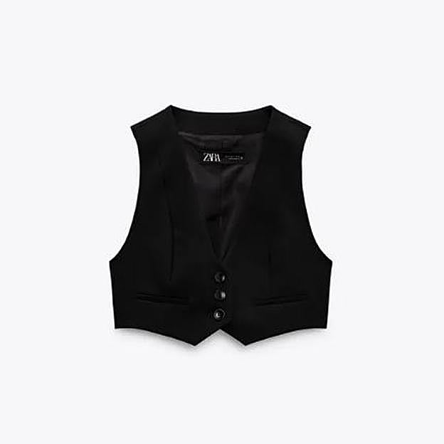 Se trata de un dos piezas en color negro formado por un chaleco sastre (25,95 euros) con cierre de botones y de corte cropped que lleva los pantalones a juego (25,95 euros). Estos son un modelo que se lleva muchísimo, de pinzas y de corte ancho con ese estilo masculino que tanto gusta. Dos prendas que quedan de lujo entre sí y a las que puedes sacar muchísimo partido, dependiendo de cómo decidas combinarlas.