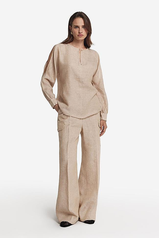 Este conjunto de Falconeri está confeccionado en un tejido ligero de lino que envuelve el cuerpo con una frescura delicada y natural. La blusa está embellecida con un elegante botón, mientras que la abertura del hombro revela una discreta sensualidad (138 euros).