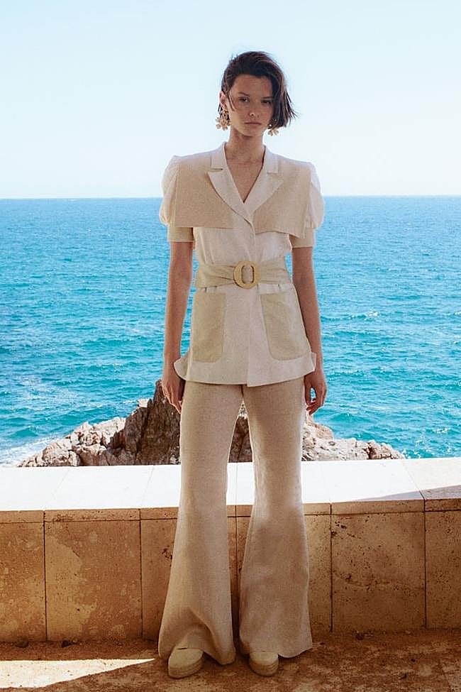 Nos encanta esta opción de Vogana con una chaqueta de manga corta abullonada y cinturón a juego (195 euros). Tiene a conjunto unos pantalones con pernera acampanada (135 euros).