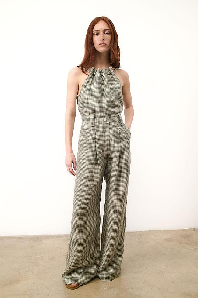Únete a la moda de los cuadros vichy con este con junto de Martín Alcalde con un pantalón de cintura alta con pincas y trabillas anchas (192 euros) y un top fruncido de cuello halter (150 euros).