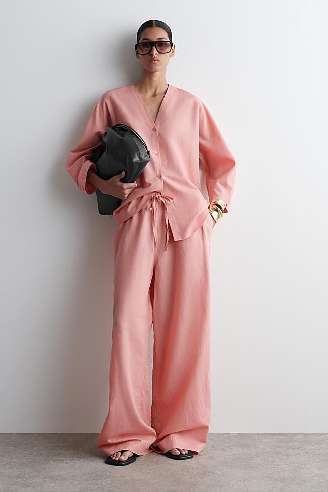 En Cos tienes este conjunto con pantalones anchos (69 euros) y una moderna camisa, diseñada en un color rosa claro, está confeccionada en una mezcla ligera de lino y algodón (69 euros).