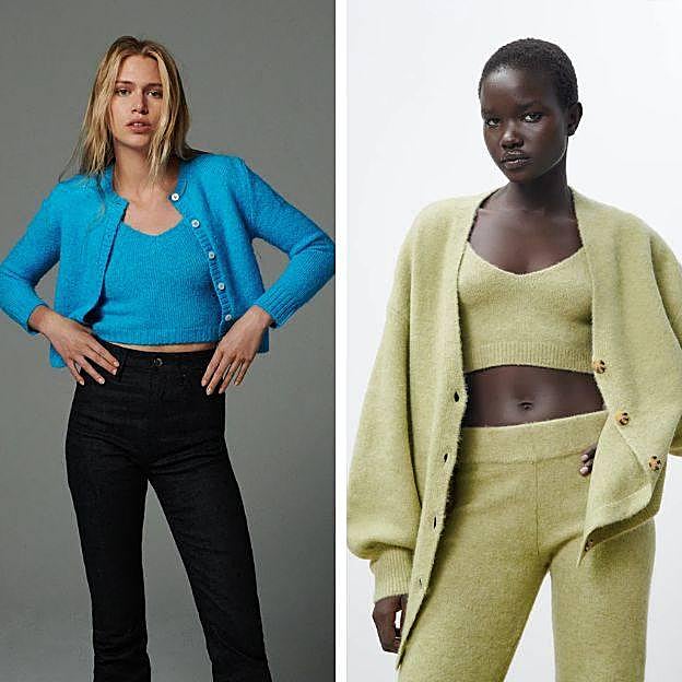 Si te va el estilo minimalista, pero no te resistes a las tendencias, Zara tiene dos propuestas ideales para ti. La primera, un set de top de tirantes y chaqueta de punto con manga francesa, ambos con acabados en rib, disponible en dos tonos, turquesa y amarillo mostaza, ambos rejuvenecedores, por un precio 15,95 el top y 25,95 la chaqueta. Un cárdigan oversize con hombros caídos, escote en pico y mangas acabadas en puño, más un crop top de tirantes, componen el segundo conjunto, en verde claro, por 29,95 euros y 12,95 euros, respectivamente. También hay un pantalón a juego para tener el total look más cómodo.