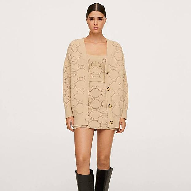 Y, por último, las más fashionistas se enamorarán de este conjunto compuesto por cárdigan oversize, top y falda, de punto soft muy agradable, con estampado geométrico y en tono beige, por 49,99 euros y 19,99. Con mocasines o botas altas y un abrigo masculino, tienes el look de diario más bonito de la temporada.