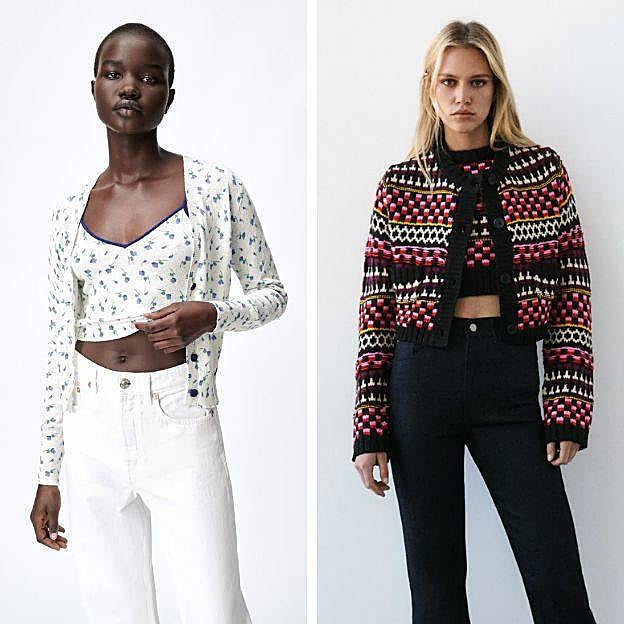 Las más femeninas y románticas se deleitarán con este combo de chaqueta de punto jacquard fina y top de tirantes, en crudo con estampado floral en azul marino, a un precio de 25,95 y 15,95 euros. Te lo puedes poner con vaqueros rectos y bailarinas rojas o nude, con falda mini o, con pantalones blancos y mocasines, para un look de estilo francés. Más apto para el invierno es este set de cárdigan jacquard ligeramente oversize y chaleco de punto, con terminaciones en rib, multicolor, de estética retro, disponible por 29,95 y 19,95 euros. Con prendas efecto piel o con un pantalón de traje, resulta un outfit para la oficina de 10.