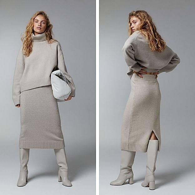 La primera combinación muy al estilo minimal escandinavo se compone de un jersey oversize en punto suave de lana con corte relajado, cuello alto, mangas extra largas y amplias, acabados en canalé y hombros caídos, en tono beige grisáceo claro, por 29,99 euros. Y, una falda midi en el mismo tejido, con talle alto, cintura elástica y abertura posterior en el bajo, también con remates de canalé, a solo 24,99 euros.