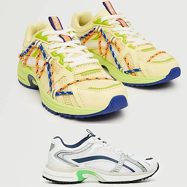 Mientras, Mango apuesta por las modas multicolor y retro estos dos modelos. El primero, una deportivas de diseño combinado con rejilla y goma, adornos de cordones a contraste y suela track curvada, en tonos verde flúor, naranja y azul, con un coste de 49,99 euros. Muy originales, son un favorito de las influencers como truco para rejuvenecer el look.