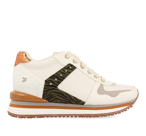 En esta ocasión, ha elegido unas sneakers blancas con cuña interna que combina detalles de animal print y toques en dorado metalizado en el talón y en marrón en la zona trasera. Además, tienen la suela con EVA y la planta es de nailon reciclado. Una combinación de colores muy ponible con tonalidades neutras a la que podrás sacar mucho partido.