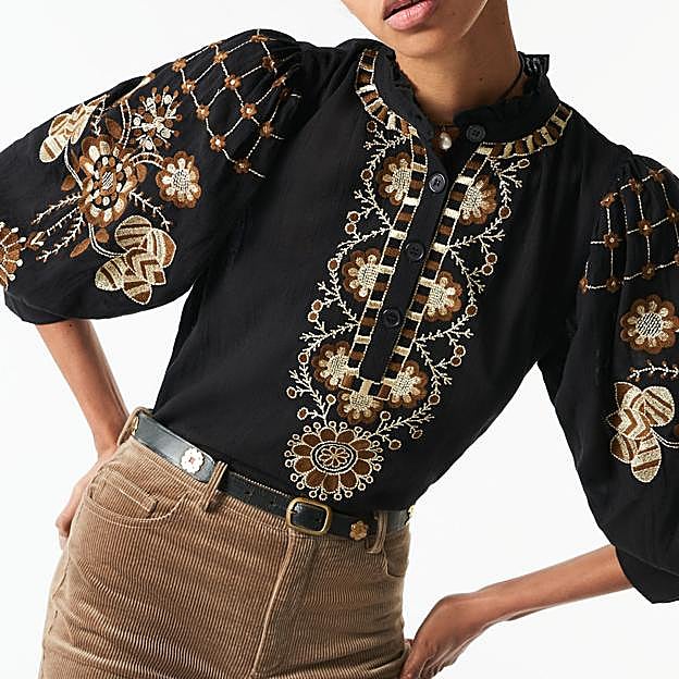 Se trata de un modelo de Antik Batik en color negro protagonizada por un bordado floral dorado y marrón y que lleva las mangas amplias ajustadas en los puños y rayas tejidas en toda la prenda que es de 100% algodón. Un diseño tipo camisero con cierre de botones en el cuello mao y que puedes comprar en la web de la firma por 190 euros. Ideal, ¿verdad? Pues si te parece demasiado oscura, atenta porque Eugenia no es la única que ha caído rendida a las blusas de esta firma.
