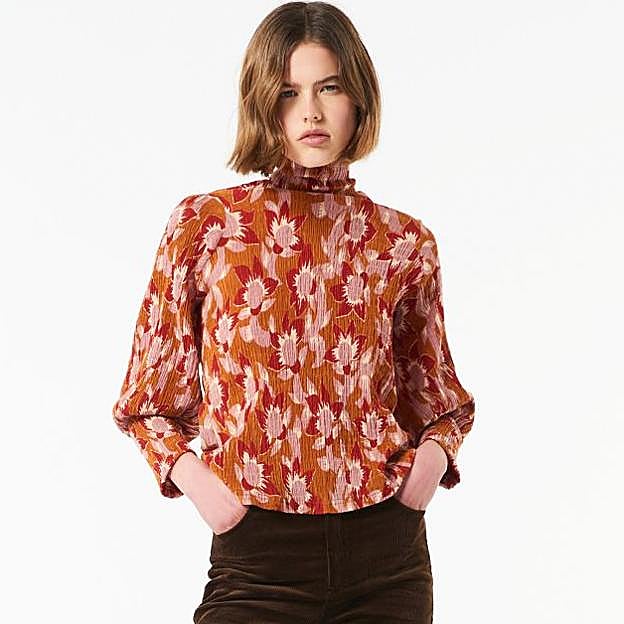 Un 'print' en tonos rosas y rojos que a contraste quedan de maravilla con el color de fondo y que, como ha demostrado la socialité, queda de lujo. Es de tejido plisado, tienes las magas abullonadas y el cuello subido y cuesta 172 euros. Ideal, ¿verdad? Pues Eugenia la combinó con unos pantalones naranjas apostando todo a ese estilo setentero tan tendencia esta temporada y dejando claro, una vez, más que añadir color es la mejor forma de rejuvenecer un look.