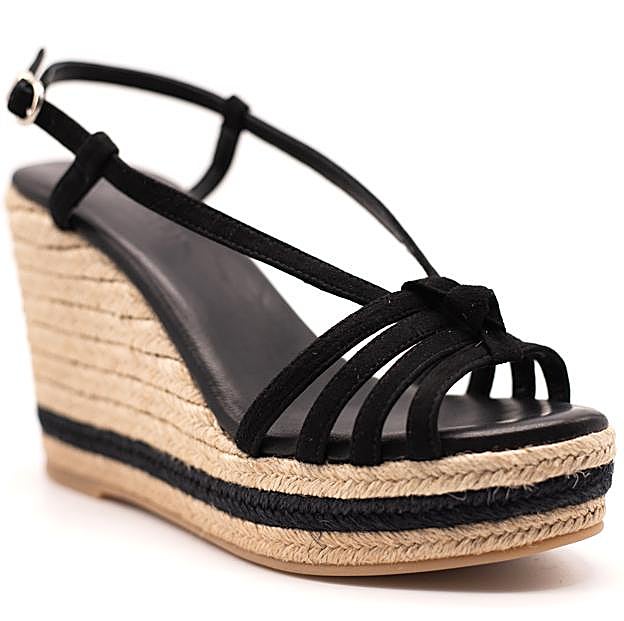 Por último, completó el look con el calzado favorito del verano: unas sandalias de cuña. En esta ocasión, optó por el 'made in Spain' con un modelo de Clooui en ante en color negro, con cuña de 12cm y 3cm de plataforma elaborada en yute natural. Unas sandalias muy cómodas con pulsera al tobillo en piel para una mayor sujeción que cuestan 169 euros.