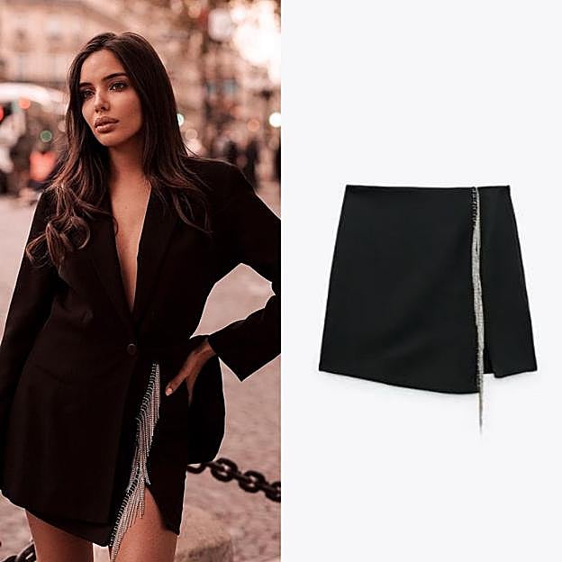 Es la falda perfecta para tus looks de noche. Es un modelo en color negro que va adornada en un lateral con unos flecos joya en color plateado. es de tiro alto, cuesta 25,95 euros y será la protagonista de tus outfits de noche. ¿Cómo combinarla? Apuesta todo al negro con un top y botas y... ¡Triunfarás!