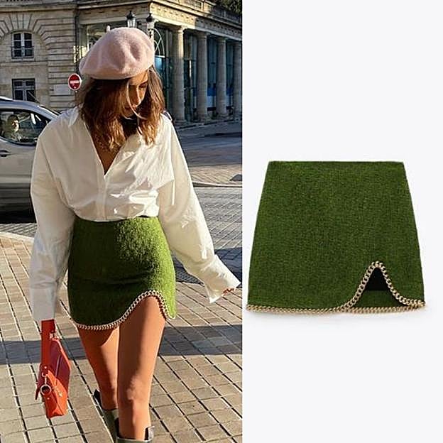 Este tejido grueso con el detalle de la cadena es una de las grandes apuestas de Zara para esta temporada. Tanto es así, que está disponible en varios colores y en vestido o falda. Esta última en color verde cuesta 29,95 euros, es una de las favoritas y está agotadísima en la página web de la marca.