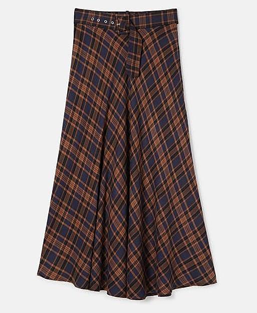 Se trata de una falda larga de cuadros en color marrón y azul marino que lleva un con cinturón a juego con hebilla y un cierre de cremallera lateral. Es una modelo que se ajusta en la parte superior y tiene una caída con mucho vuelo. Unas características que hacen que sea un diseño súper cómo y ponible que combinar con todos tus looks y que se convertirá en el favorito de la temporada. Cuesta 39,99 euros (cómprala aquí) y está disponible en otros dos tonos: en burdeos con blanco y en rojo con negro.