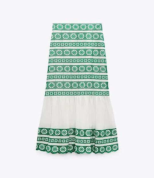 Se trata de una falda de largo midi que tiene un diseño original y muy diferente y que lleva uno de los colores de la temporada como protagonista: el verde. Es de talle alto, con el bajo acabado en volantes y tiene como detalle principal un tejido con bordados en horizontal ideal.