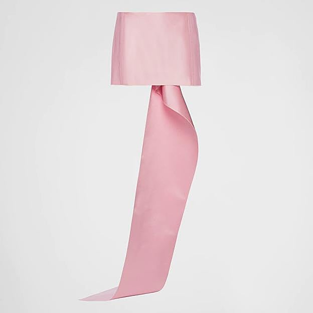 Se trata de una falda mini de corte recto y confeccionada en tejido satinado que está protagonizada por una especie de cola que adorna la parte trasera de la prenda. Es una falda que forma parte de la colección Primavera-Verano 2022 de la firma y que tiene como objetivo atraer la nueva idea de la alta costura, que se esboza en diseños que recontextualizan prendas del pasado a través de nuevas estructuras intrínsecamente ligadas al cuerpo y, por lo tanto, a la seducción.