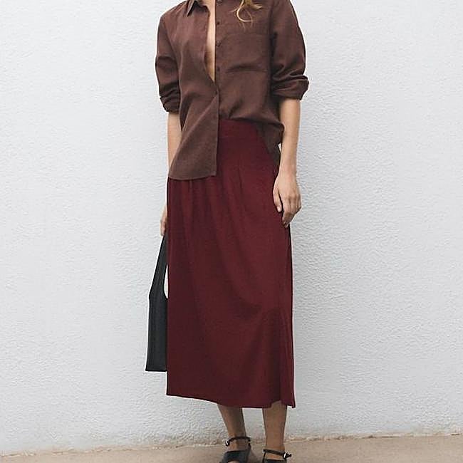 Si te pones cualquier camisa sencilla, sea de lino o algodón, con unas bailarinas o mocasines clásicos y esta falda midi de tablas en color burdeos, causarás sensación (e irás comodísima a diario). Tiene tiro alto. Se ajusta a la cintura. Incorpora pliegues en la zona de las caderas. El corte es fluido. Y, cuenta con ligero vuelo.