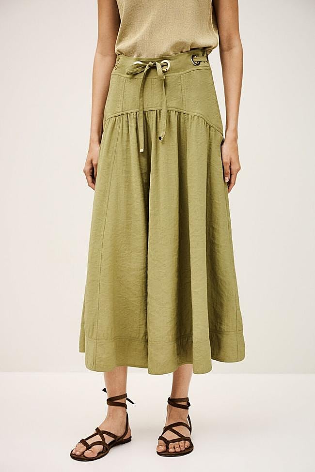 En Ba&sh hemos encontrado esta falda en color verde caqui que destaca por su corte bajo y el detalle de un cinturón incorporado entrabillas con anillas metalizadas. Precio: 185 euros.