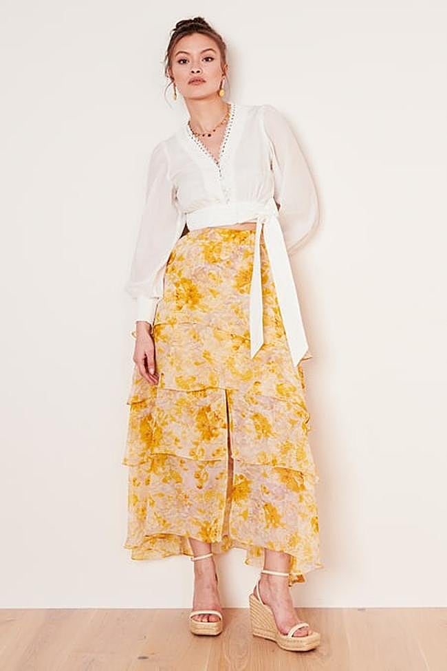 Si te gustan los modelos con movimiento y presencia, prueba con esta falda de estampado floral en color amarillo de Claire Luise. Es un diseño de volantes y talle alto que queda de maravilla. Precio: 109 euros.