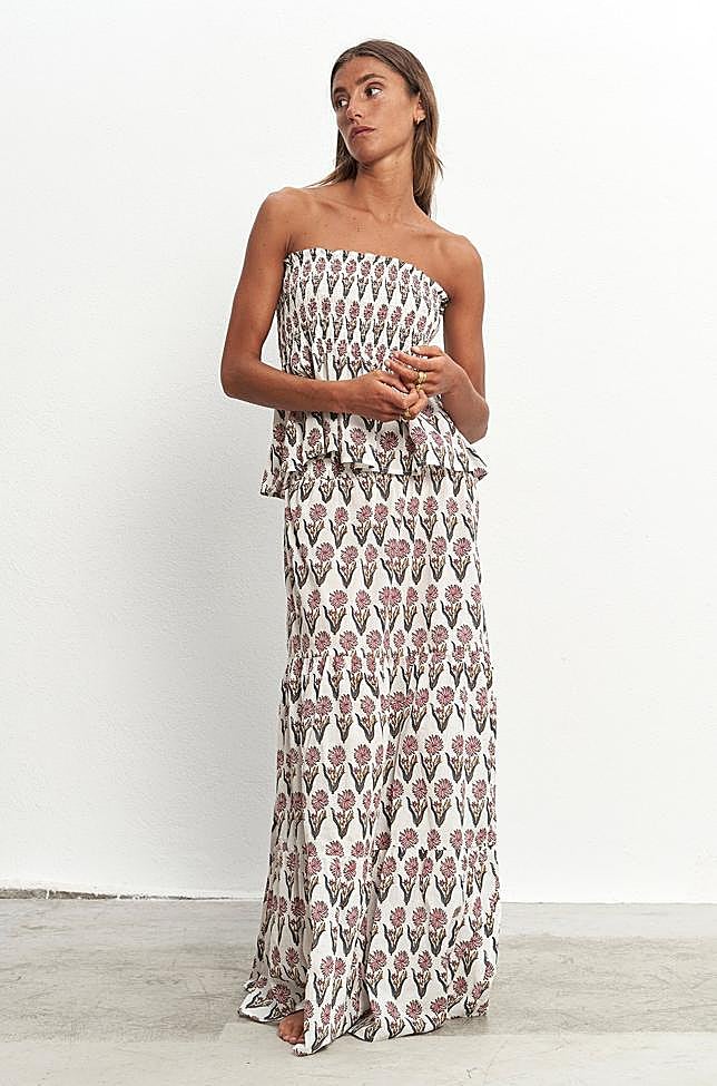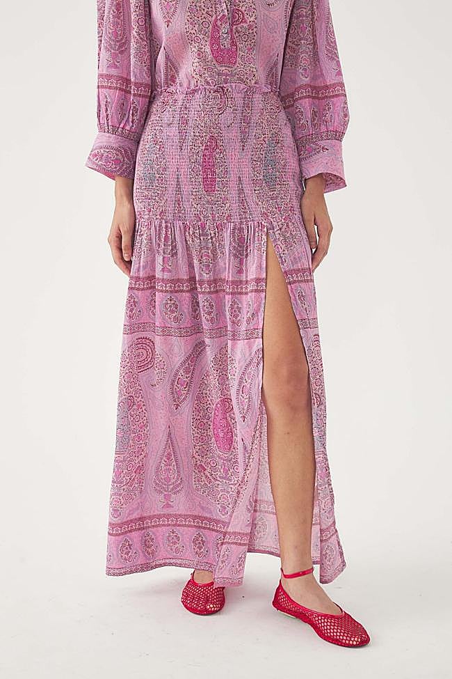 Esta falda larga de algodón velado con forro de algodón suave es de Antik Batik. Luce un estampado único aplicado con la técnica tradicional del batik y cuenta con un cómodo smock en la cintura. Precio: 180 euros.