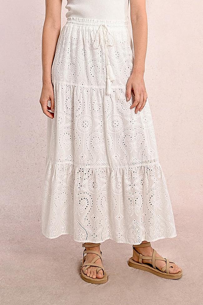 Las faldas blancas son un sí esta temporada y está apuesta de Molly Bracken es perfecta. Es una falda larga, de tiro alto y cintura elástica con lazada, un modelo en tejido étnico paisley y volantes. Precio: rebajada a 59,40 euros.