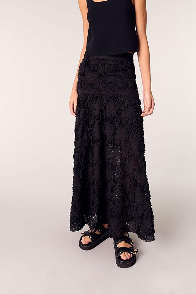 Esta falda larga es de tul adornado con flores bordadas es de Maje. Tiene un corte voluminoso y caída acampanada, que crea un movimiento ligero y elegante y un forro corto para una comodidad óptima, mientras que una banda elástica marca la cintura. Precio: 275 euros.